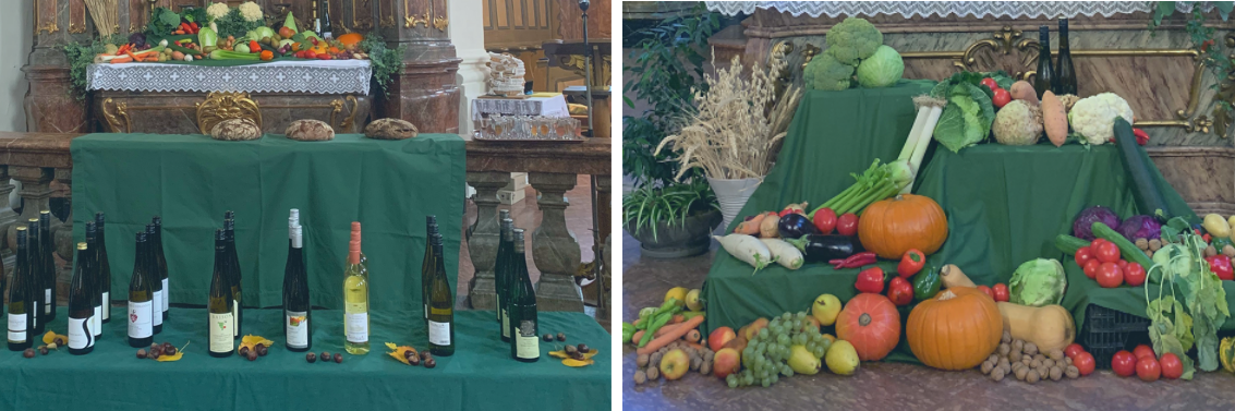 Im Anschluss an den Gottesdienst bleibt Zeit zum Verweilen und Zusammensein bei Wein, gestiftet von den Winzern, und dem Erntedankbrot aus der Bäckerei Preis.