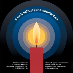Es ist ein aktives Zeichen gegen die Verfolgung und Bedrohung von Jüdinnen und Juden: Mit der Aktion „Mein Licht gegen die Dunkelheit“ ruft die Region Hochtaunus und Main-Taunus im Bistum Limburg zusammen mit zahlreichen Kooperationspartnerinnen und -partnern dazu auf, zur Zeit des jüdischen Lichterfests Chanukka von Freitag, 8. Dezember, bis Freitag, 15. Dezember 2023, abends von 19 bis 20 Uhr eine brennende Kerze ins Fenster zu stellen. Hintergrund ist der Angriff der Terrororganisation Hamas auf Israel am 7. Oktober und die zunehmende Sorge über den offenen Antisemitismus in Deutschland.